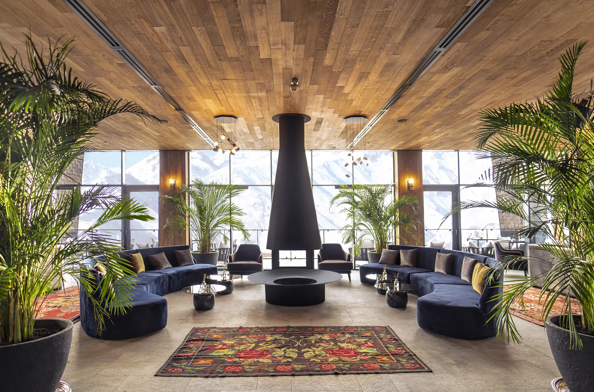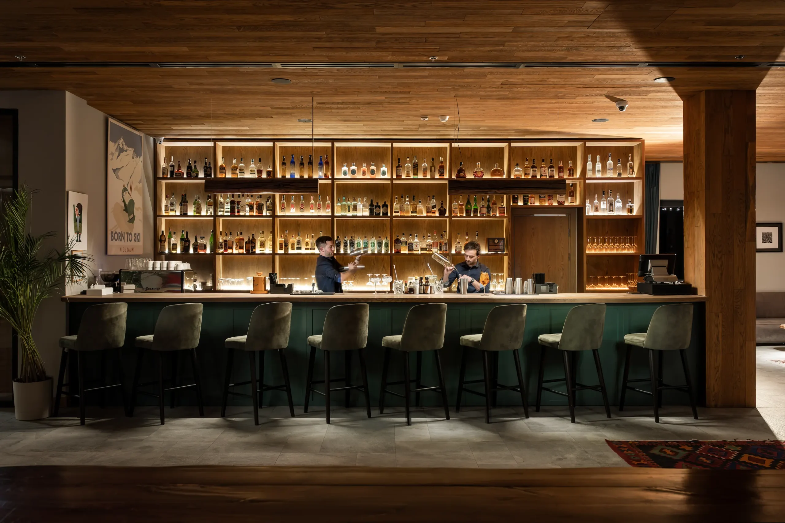 Relaxed and welcoming, the Lobby Bar offers cocktails, Georgian wine, and light bites in a setting of natural warmth and mountain views — the perfect spot to gather, celebrate, or simply pause between adventures.