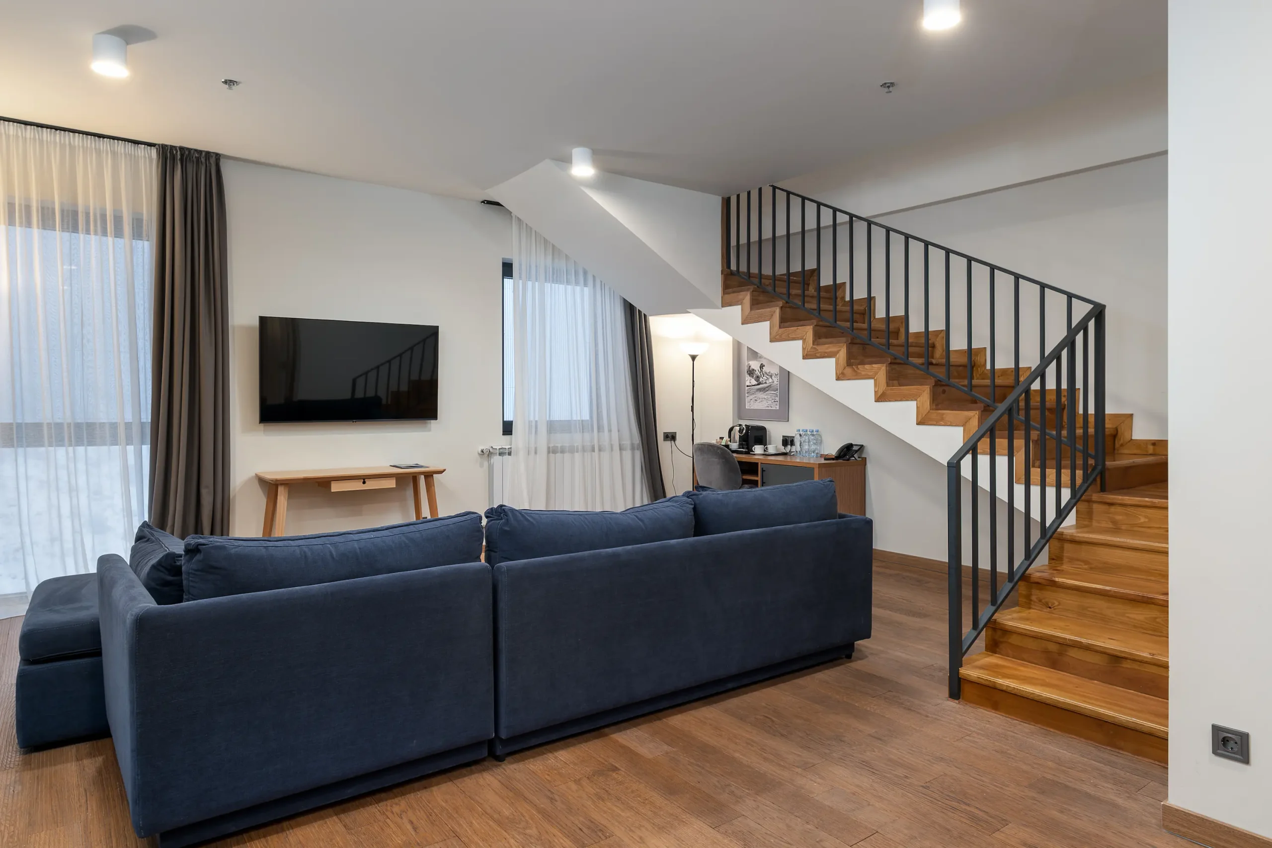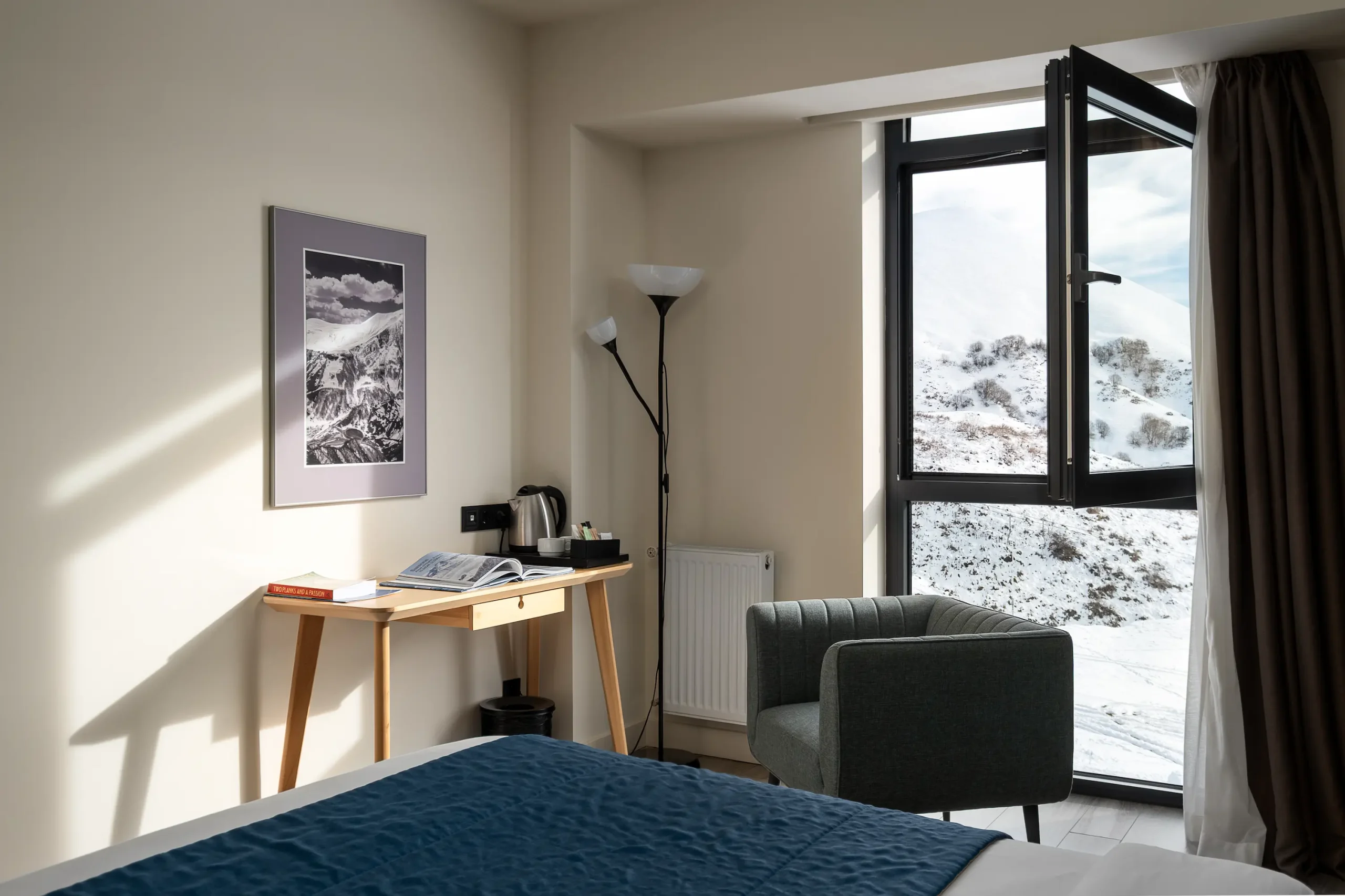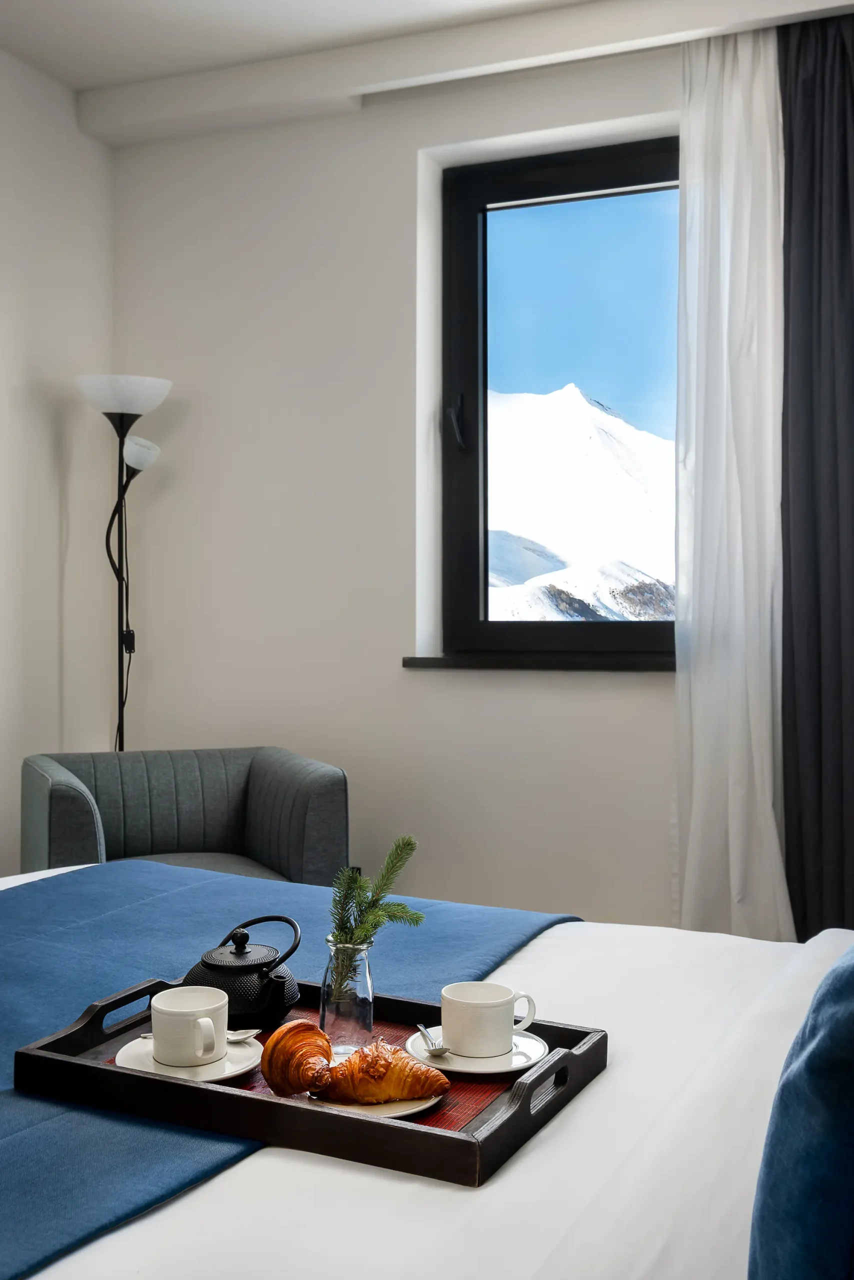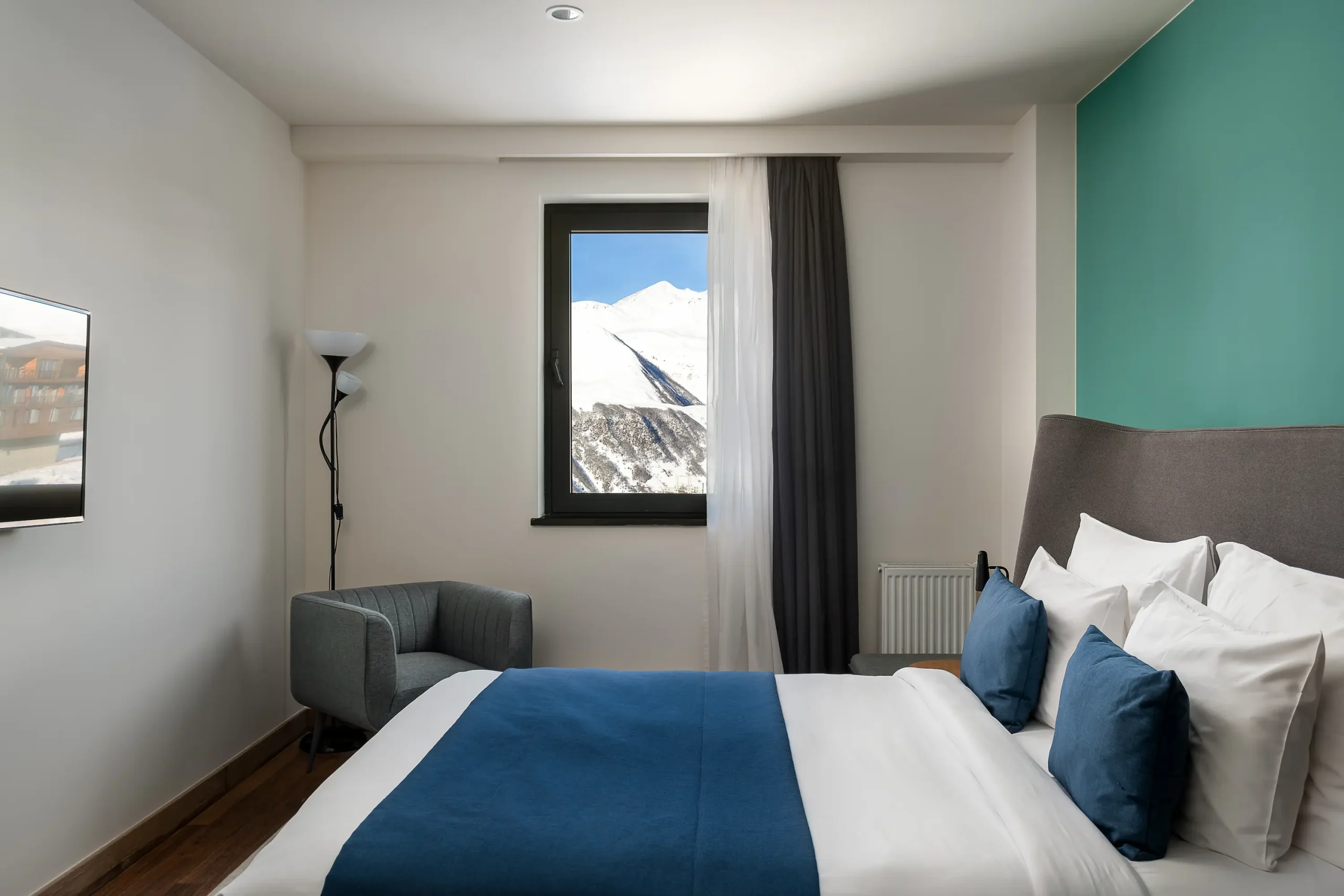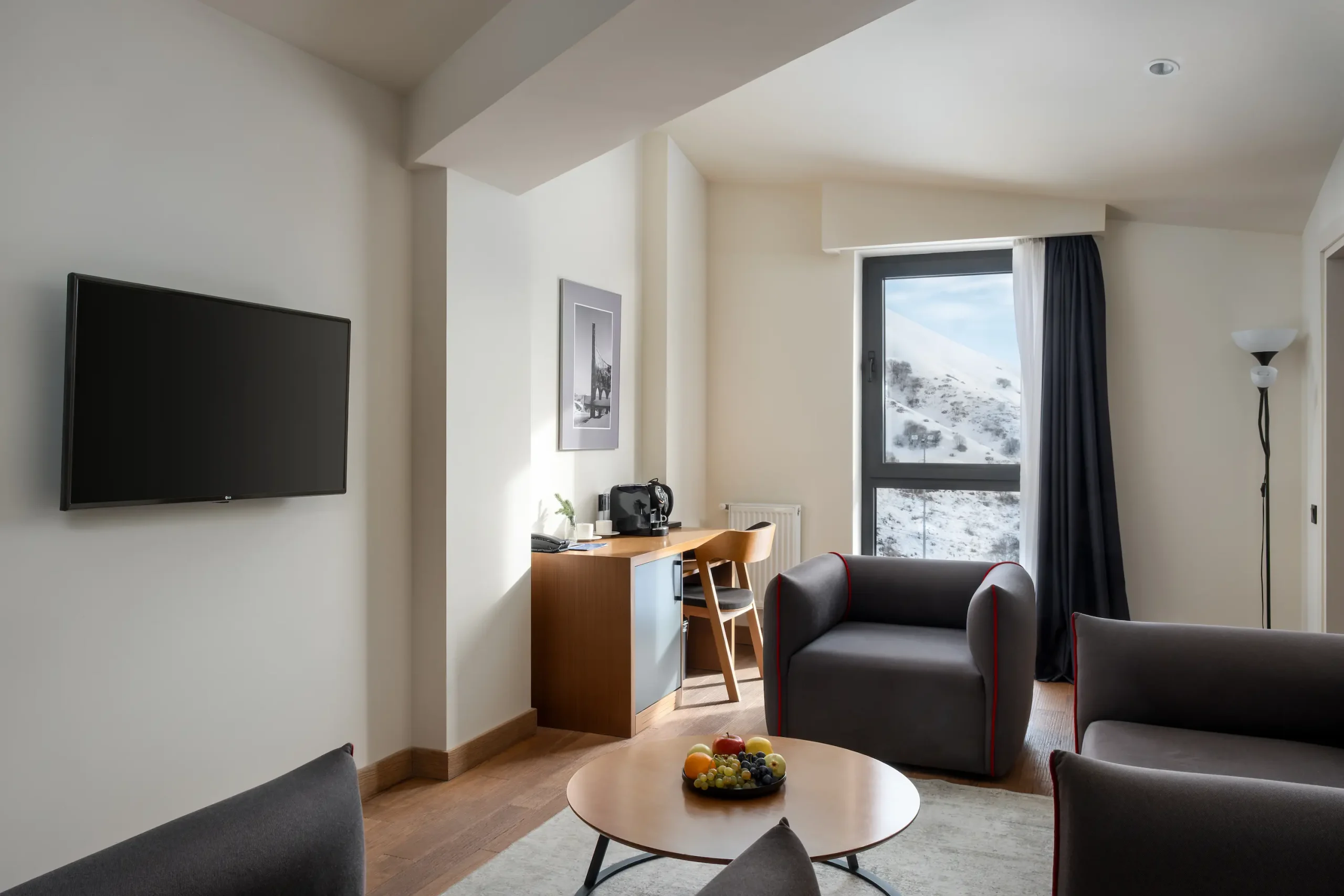 Spacious and inviting, our 45 m² Junior Suites feature two separate rooms and panoramic views of Gudauri’s slopes. Designed for comfort and ease, they offer plenty of space to unwind — the ideal choice for longer stays or a little extra room to relax in the mountains.