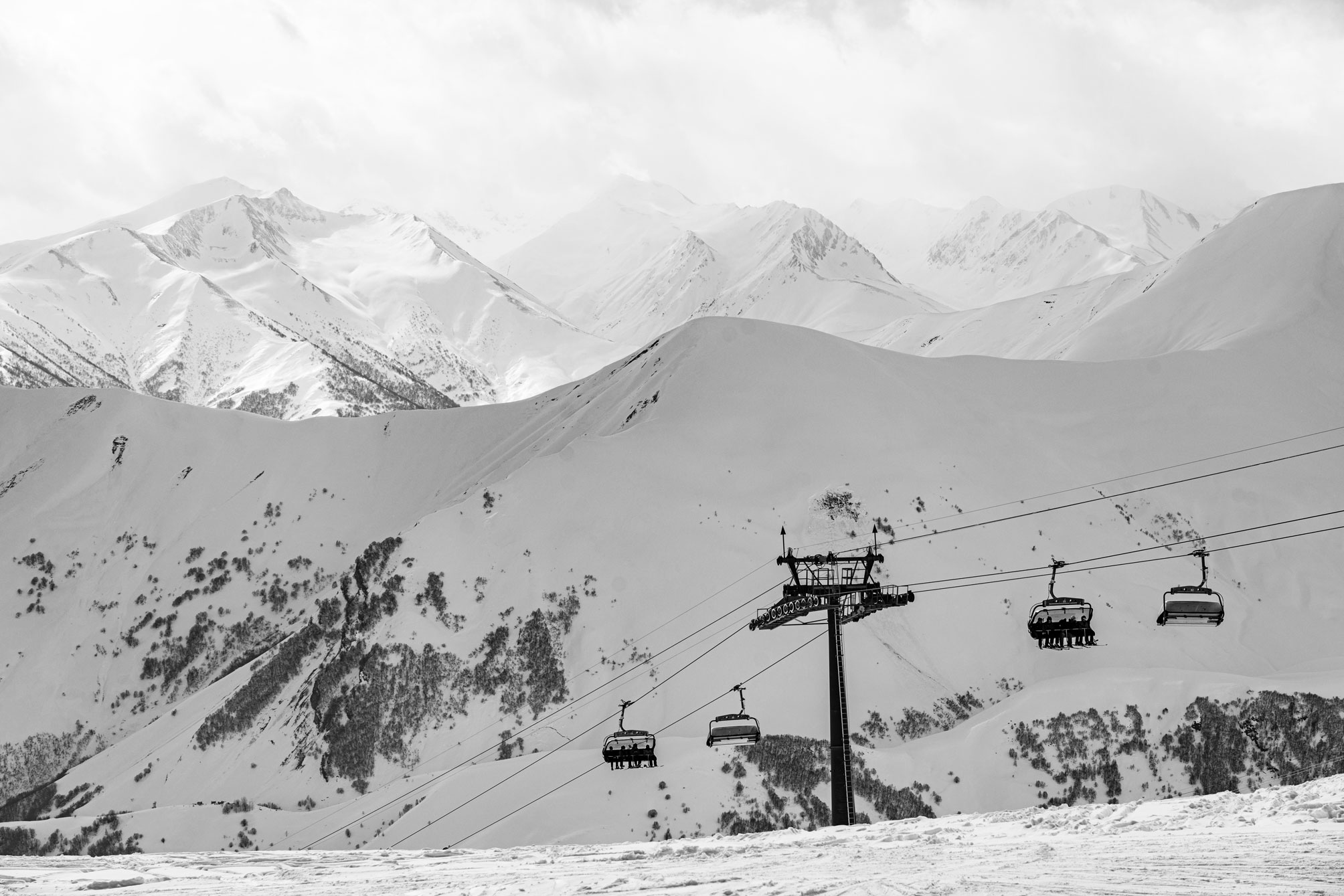 With elevations ranging from 2,000 to 3,300 meters, Gudauri offers more than 80 kilometers of groomed runs certified by the FIS, and 14 modern cable lifts by Doppelmayr and Poma. Its wide-open slopes, deep powder, and endless off-piste terrain make it a haven for freeride and backcountry enthusiasts.